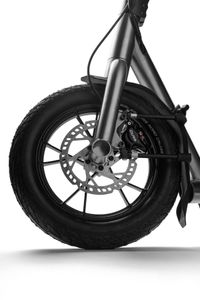 Roue avant équipé d'un pneu gravel, soutenue par une mono fourche en titane. Freins à disques hydrauliques.